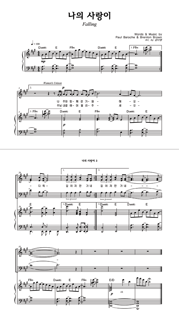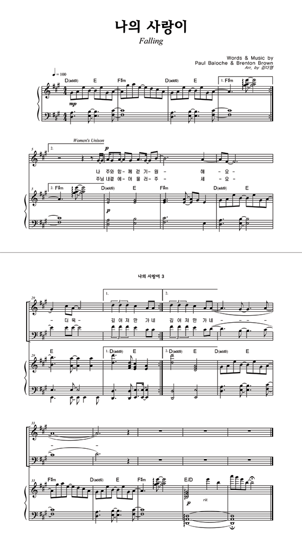 | 나의 사랑이 | 성가 2부 + 피아노 반주 |