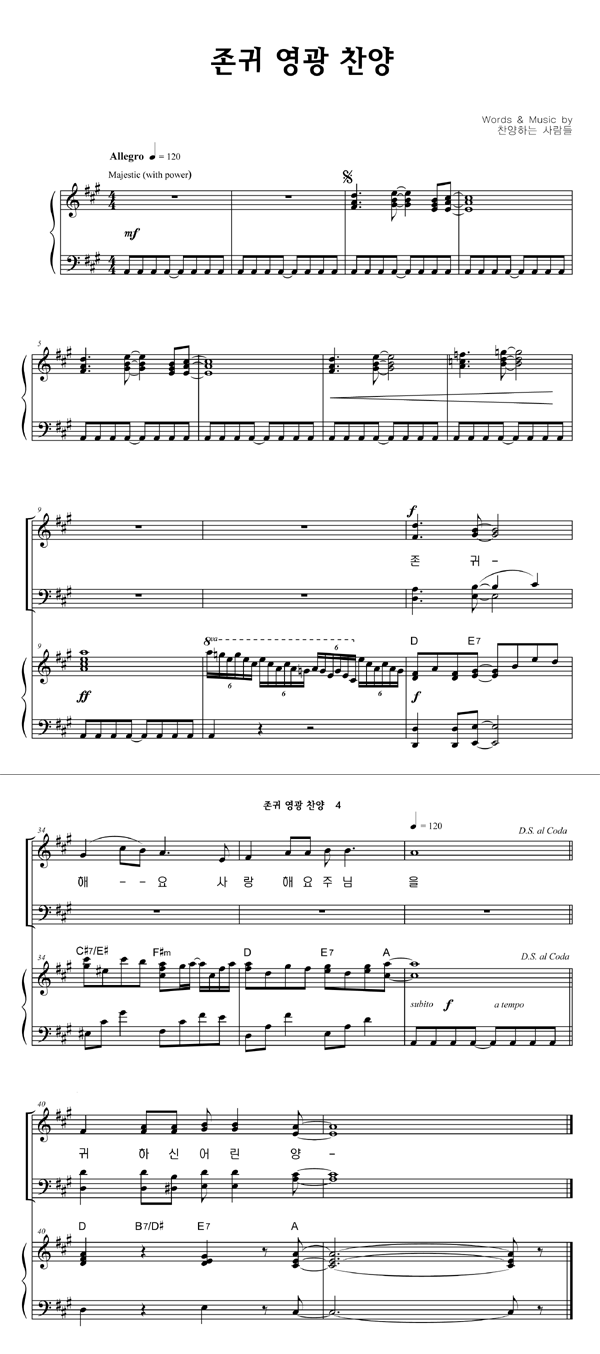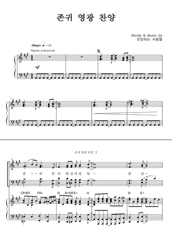 | 존귀 영광 찬양 | 성가 4부 + 피아노 반주 |