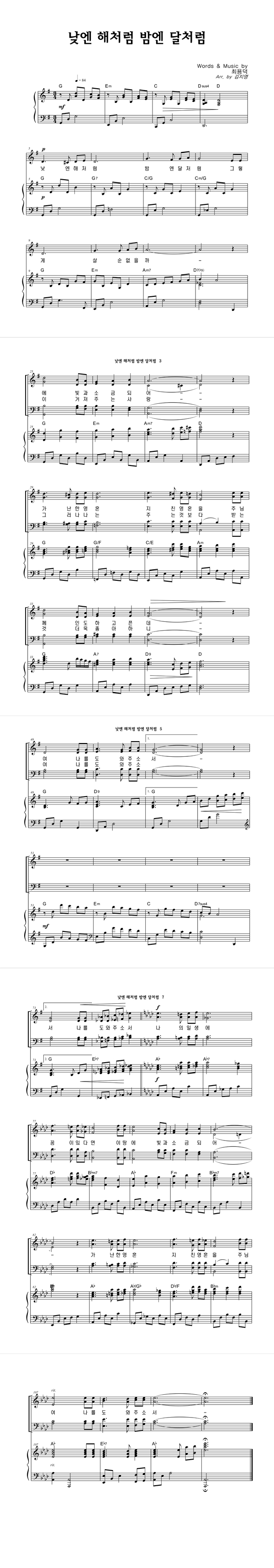 | 낮엔 해처럼 밤엔 달처럼 | 성가 2부 + 피아노 반주 |