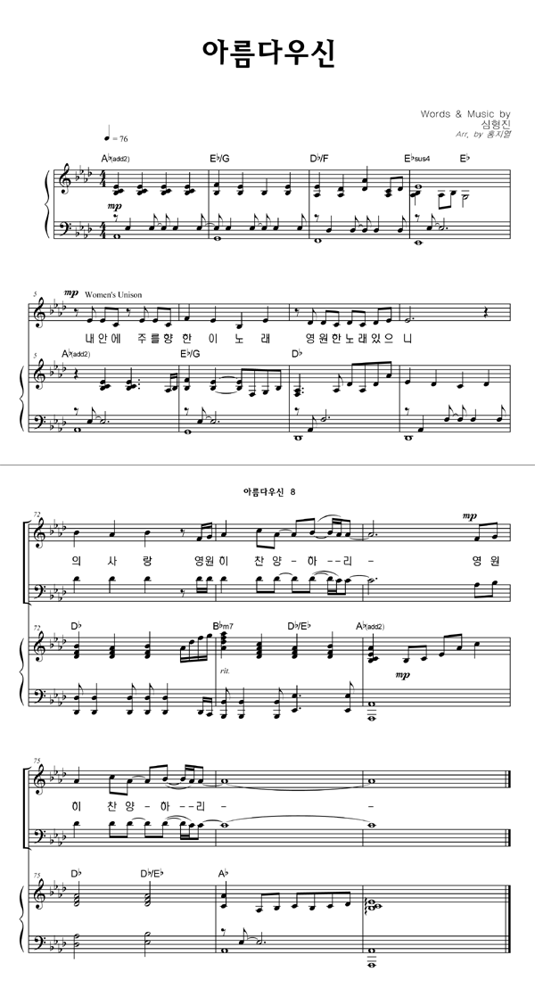 | 아름다우신 | 성가 2부 + 피아노 반주 |