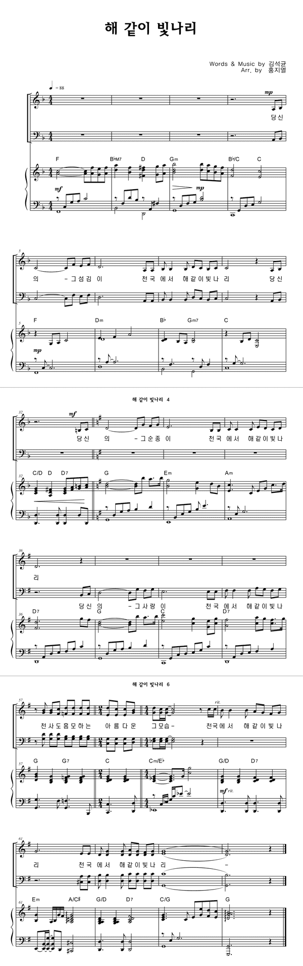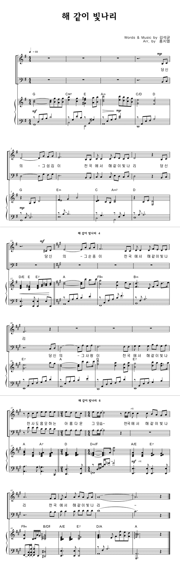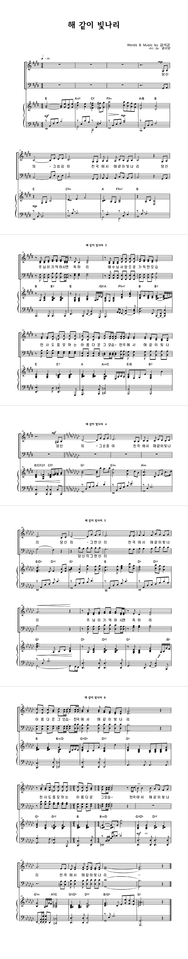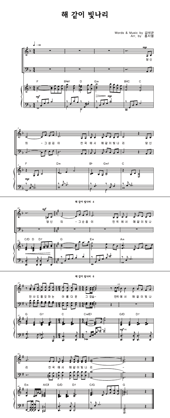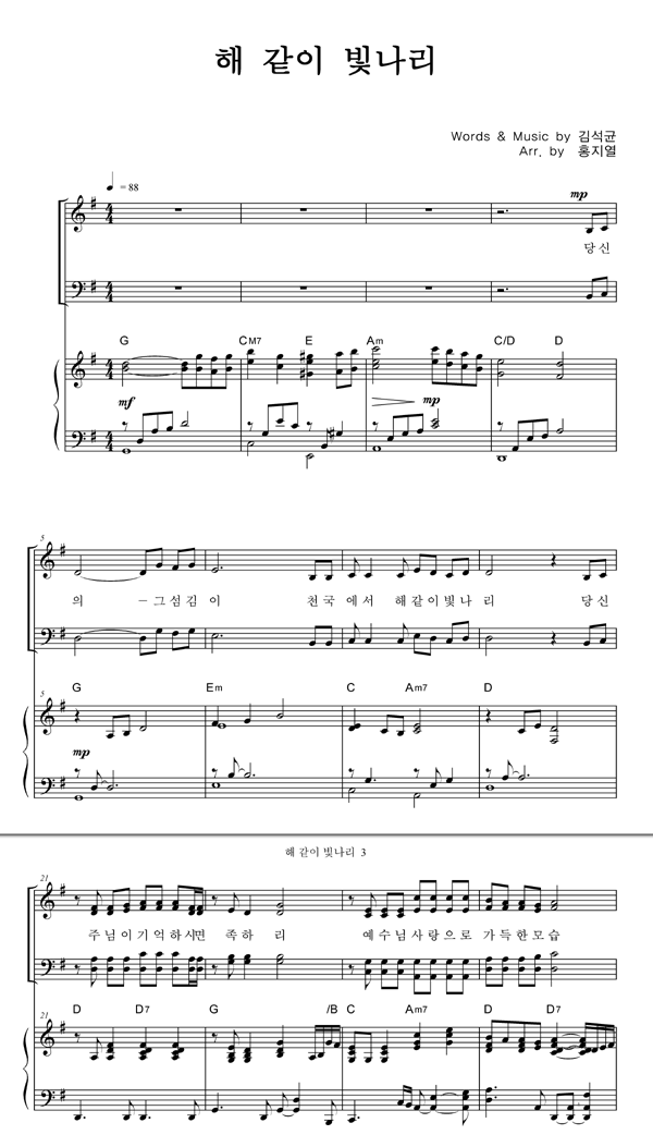 | 해같이 빛나리 | 성가 3부 + 피아노 반주 |
