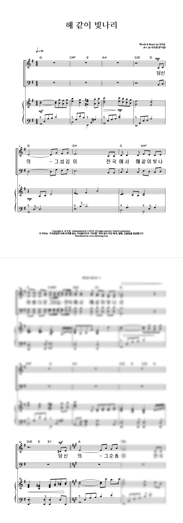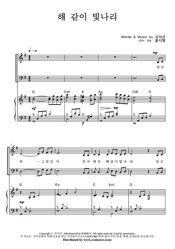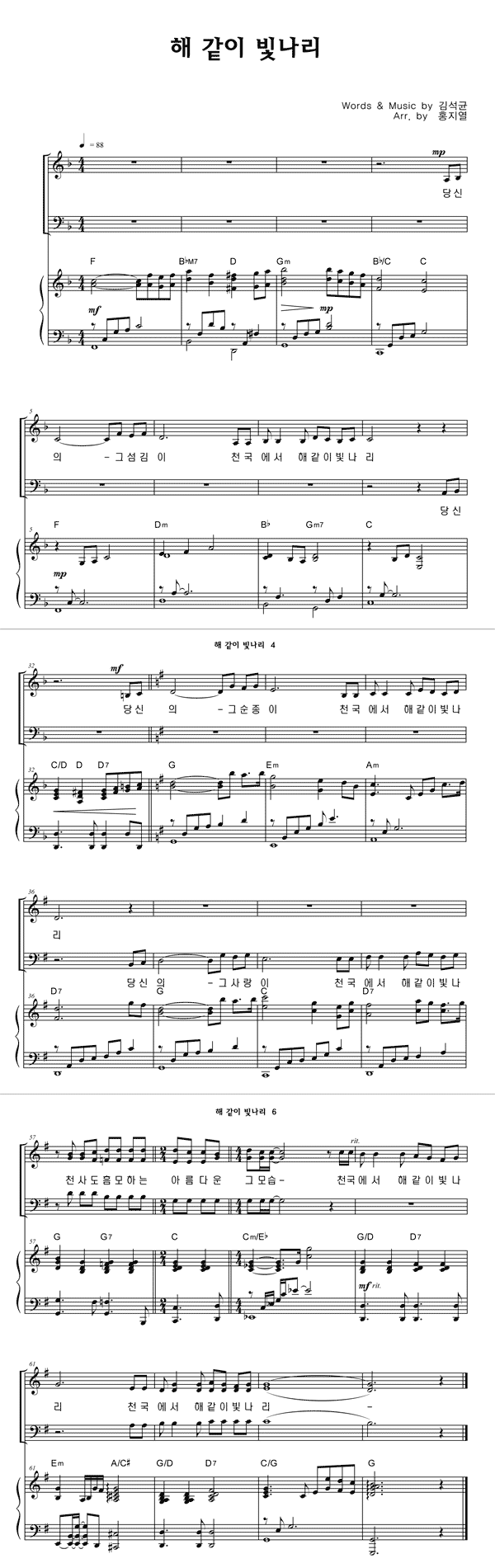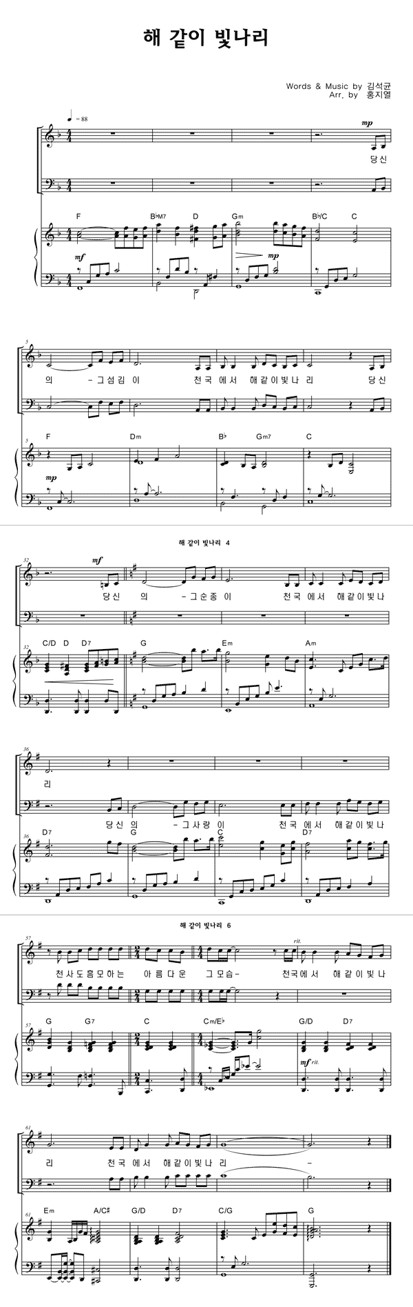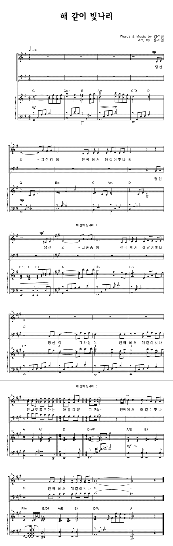 | 해같이 빛나리 | 성가 3부 + 피아노 반주 |