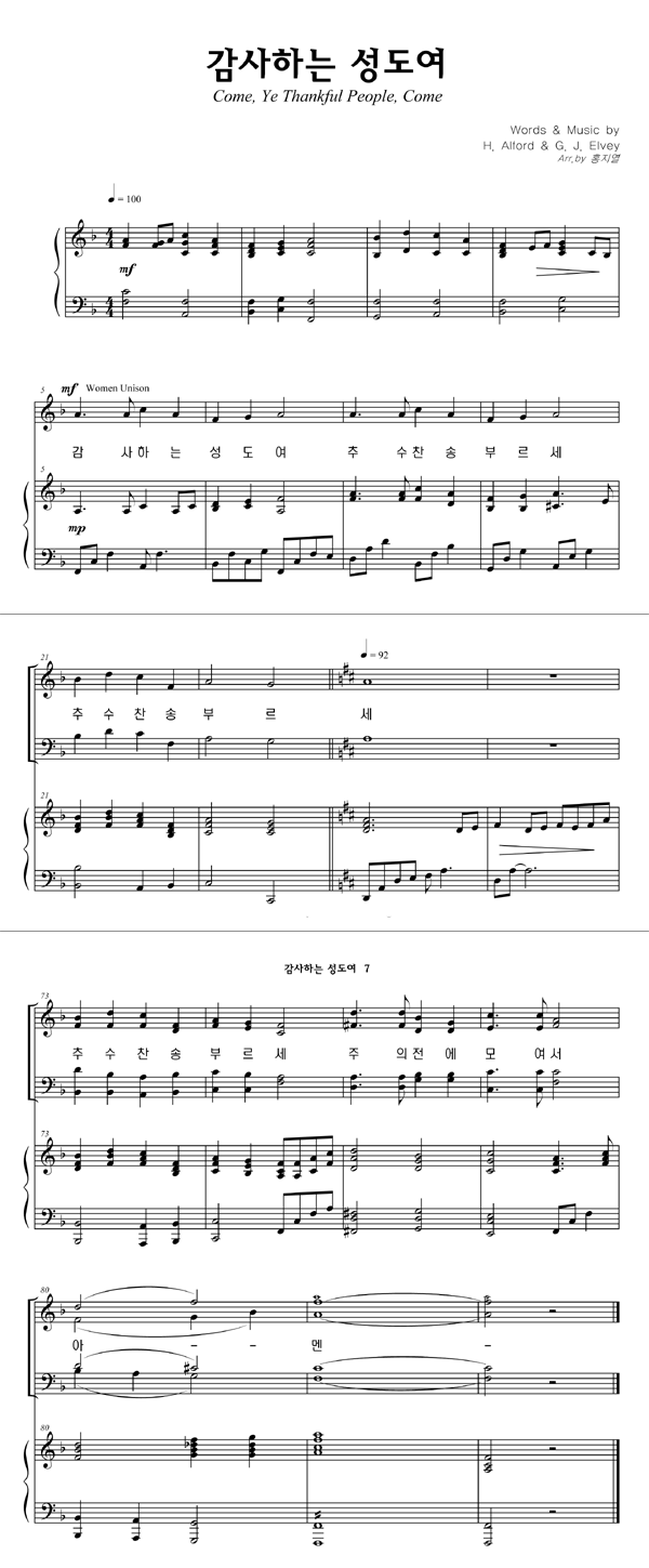 | 감사하는 성도여 (찬송가 587장) | 성가 2부 + 피아노 반주 |