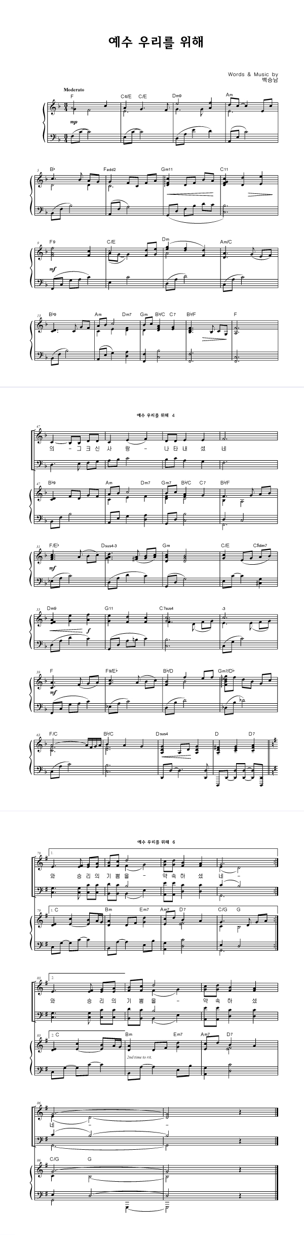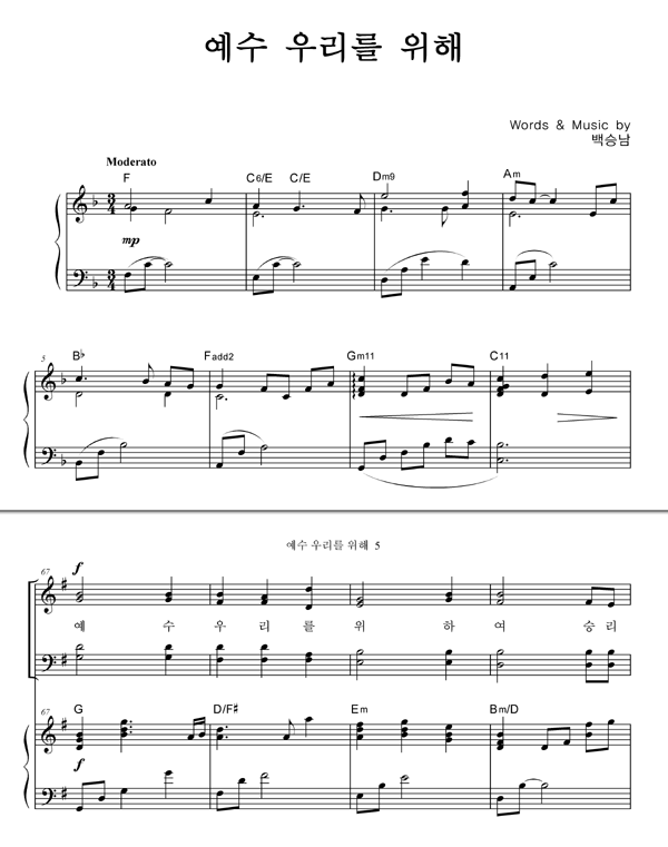 | 예수 우리를 위해 | 성가 4부 + 피아노 반주 |