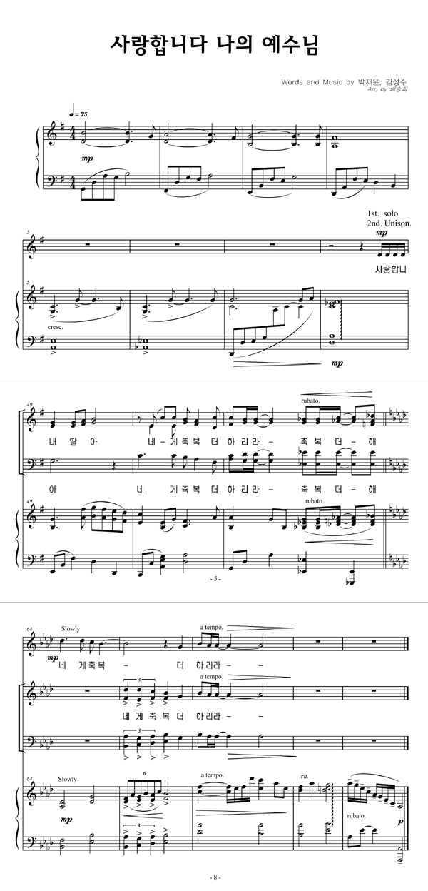 | 내가 너를 사랑함이라 | 성가 2부 + 피아노 반주 |