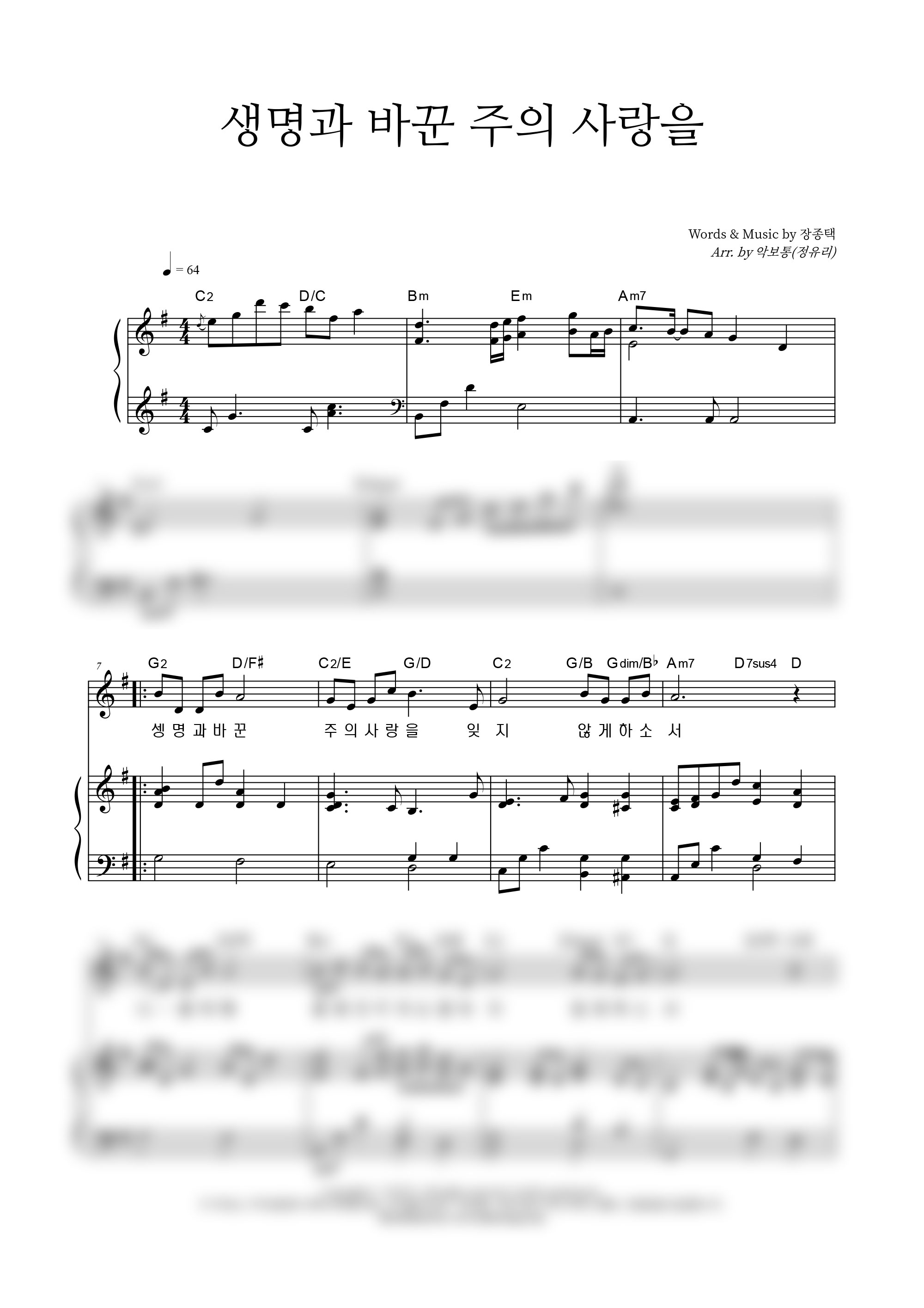 | 생명과 바꾼 주의 사랑을 | 성가 2부 + 피아노 반주 |