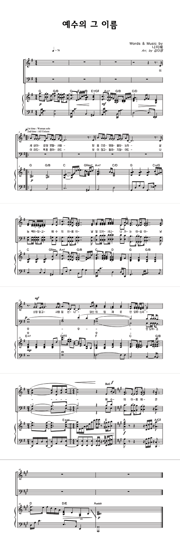 | 예수의 그 이름 | 성가 2부 + 피아노 반주 |