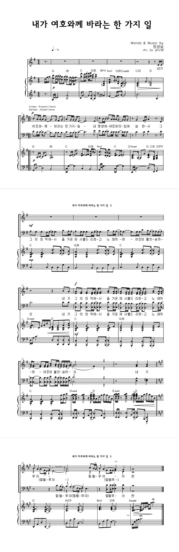 | 내가 여호와께 바라는 한가지 일 | 성가 4부 + 피아노 반주 |