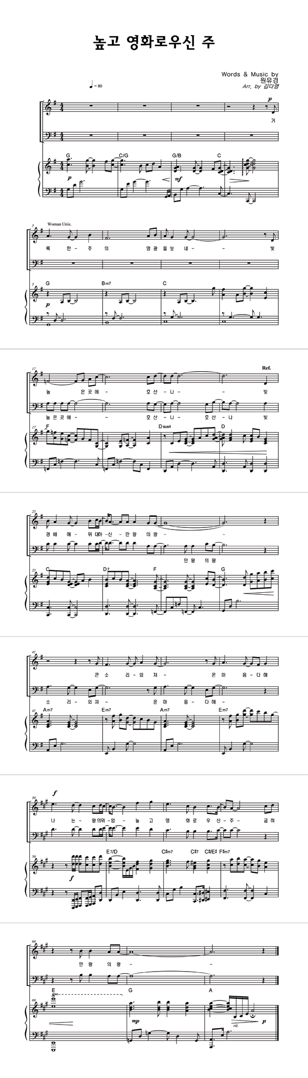 | 높고 영화로우신 주 | 성가 3부 + 피아노 반주 |