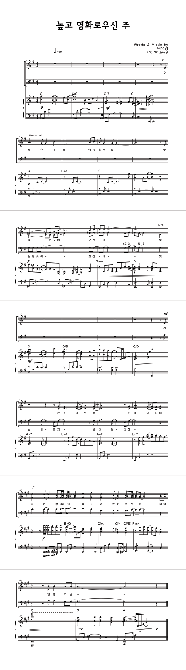 | 높고 영화로우신 주 큰글씨 | 성가 4부 + 피아노 반주 |