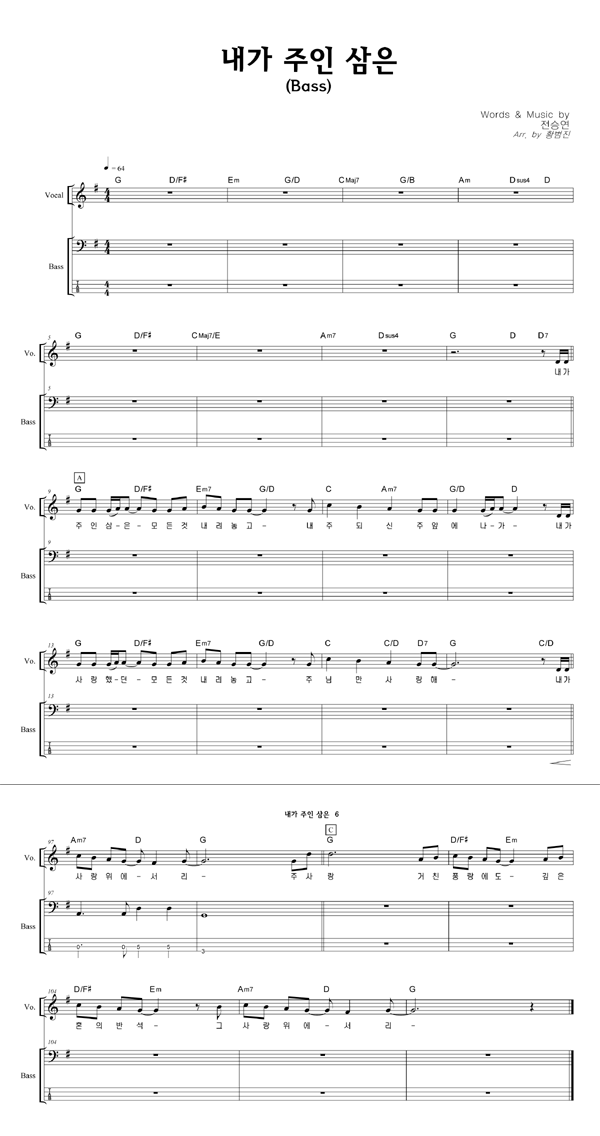 | 내가 주인 삼은 | 성가 2부 + 피아노 반주 |