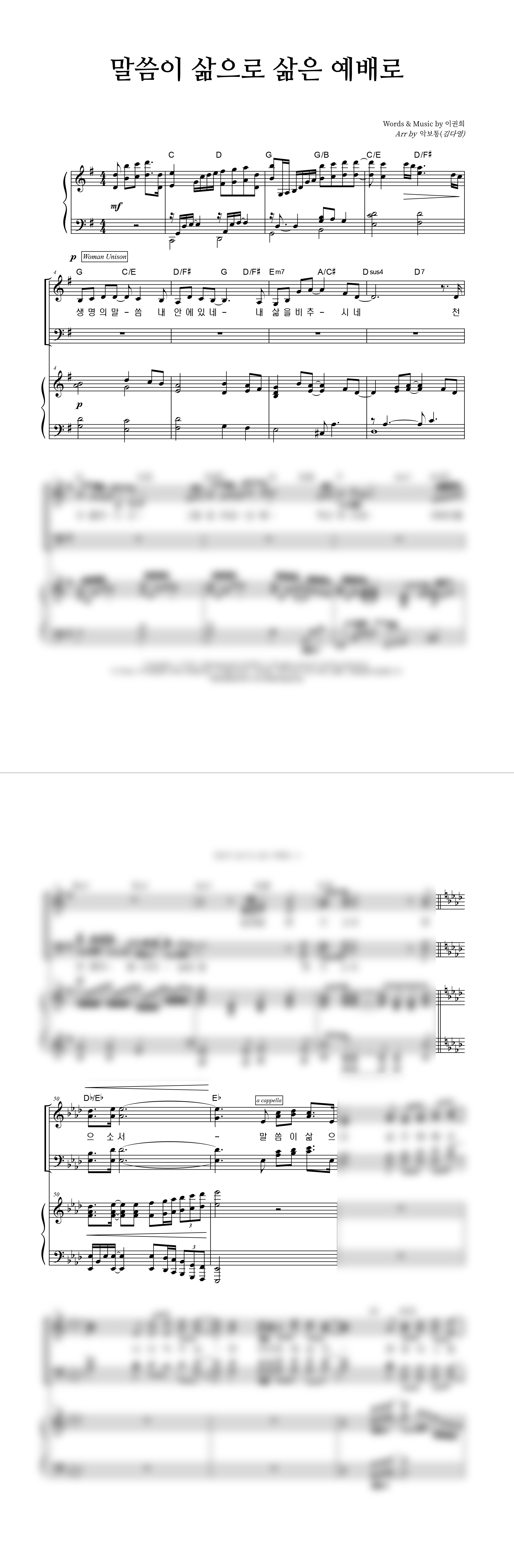 | 말씀이 삶으로 삶은 예배로 | 성가 4부 + 피아노 반주 |