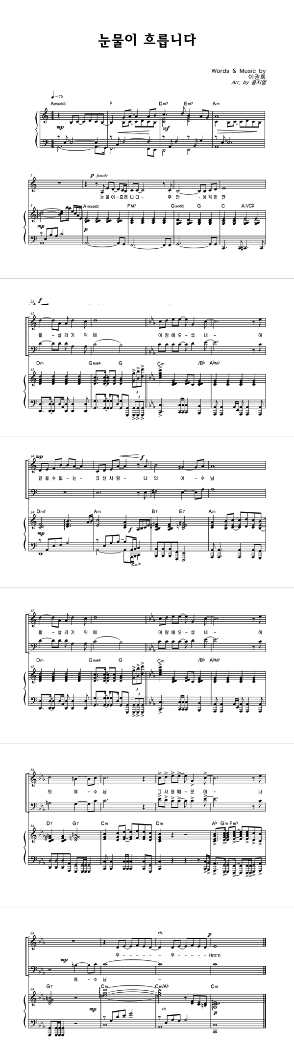 | 눈물이 흐릅니다 | 성가 3부 + 피아노 반주 |