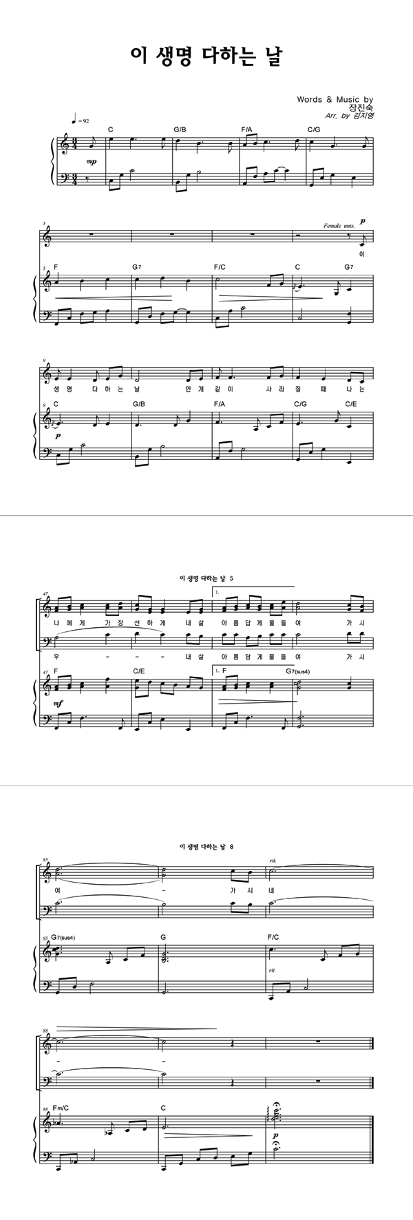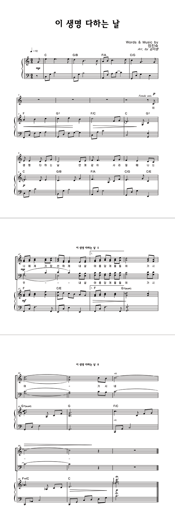 | 이 생명 다하는 날 | 성가 3부 + 피아노 반주 |