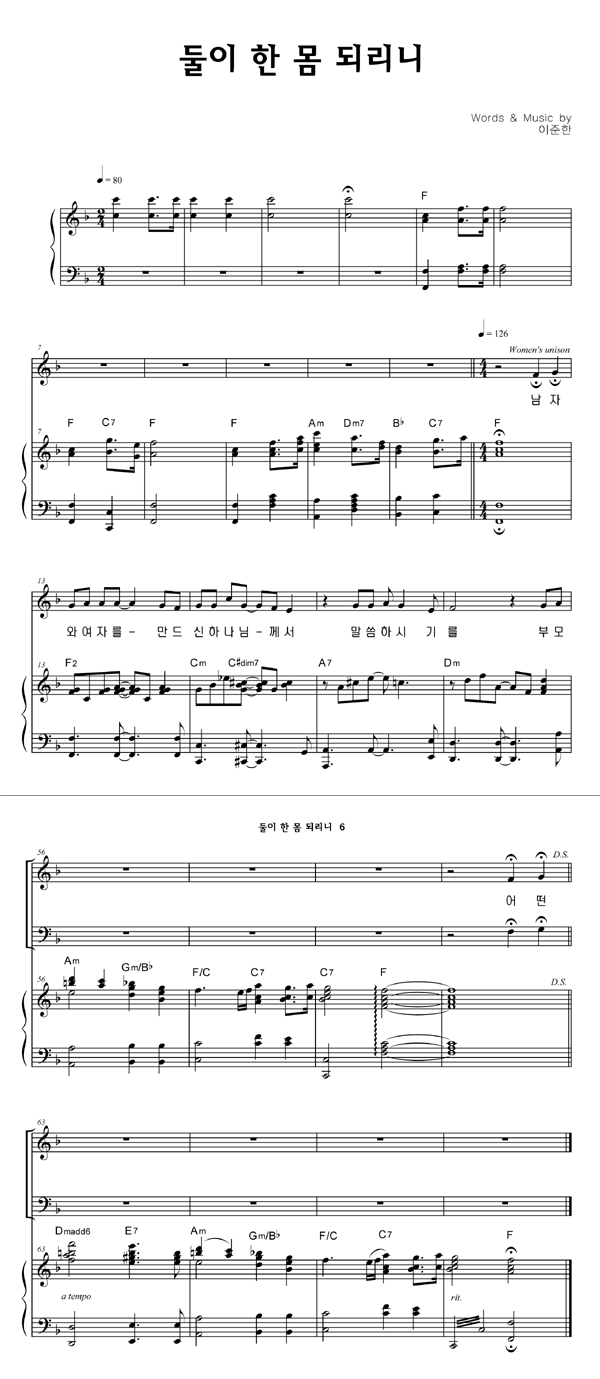 | 둘이 한 몸 되리니 | 성가 4부 + 피아노 반주 |