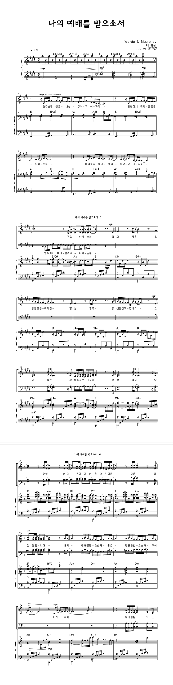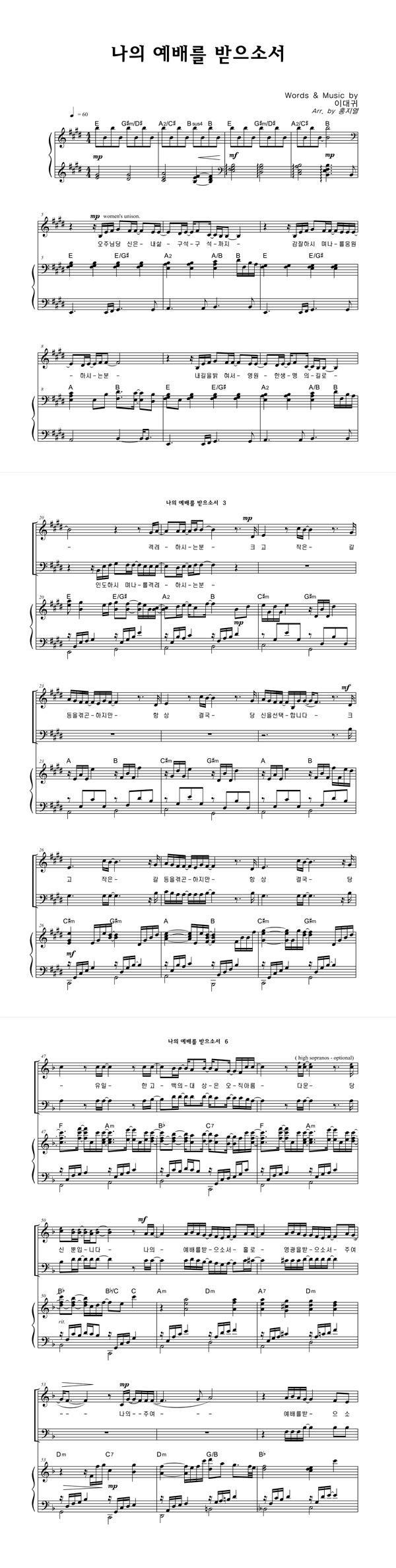 | 나의 예배를 받으소서 | 성가 3부 + 피아노 반주 |