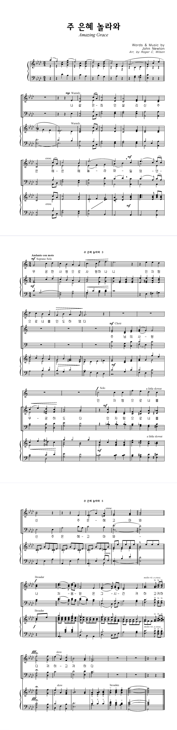 | 주 은혜 놀라와 | 성가 4부 + 피아노 반주 |