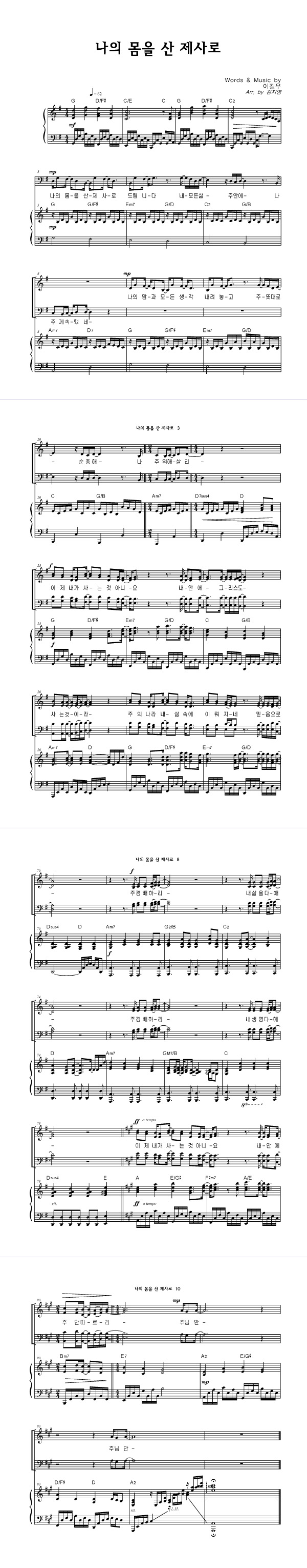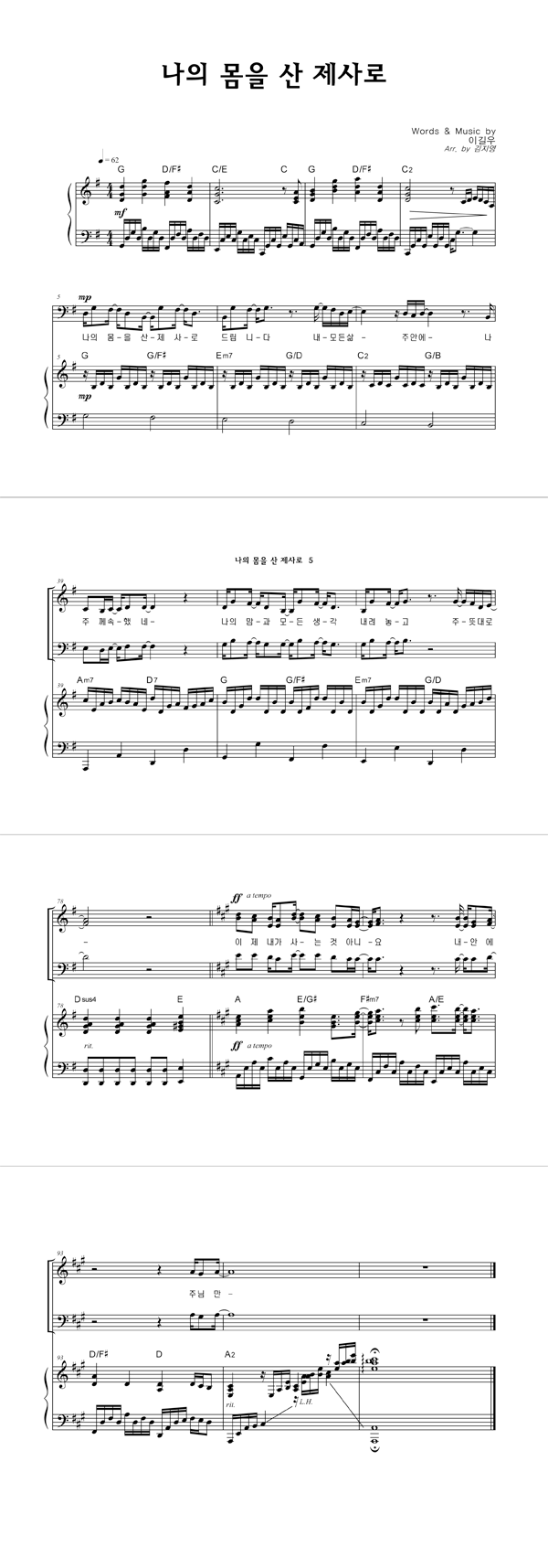 | 나의 몸을 산 제사로 | 성가 4부 + 피아노 반주 |