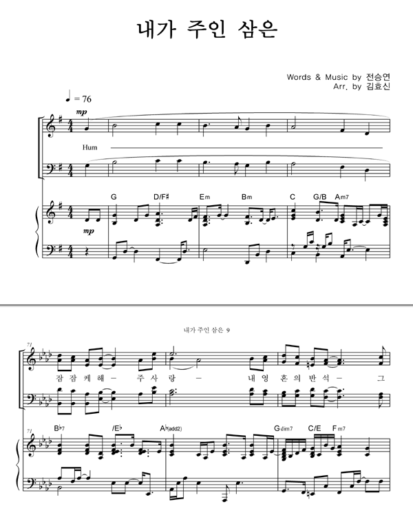 | 내가 주인 삼은 | 성가 2부 + 피아노 반주 |