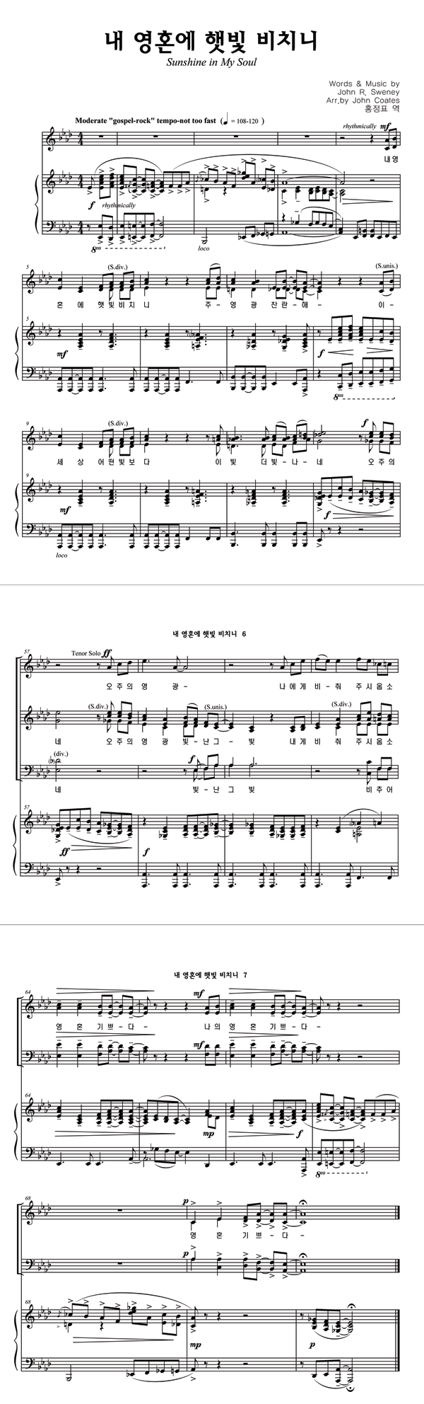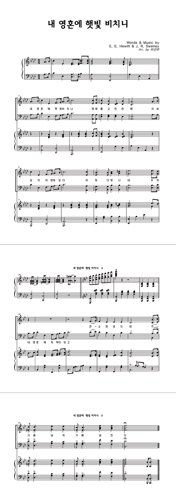 | 내 영혼에 햇빛 비치니 | 성가 4부 + 피아노 반주 |