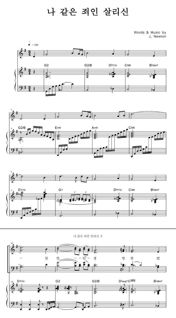 | 나 같은 죄인 살리신 (찬송가 305장) | 성가 2부 + 피아노 반주 |