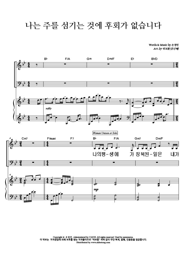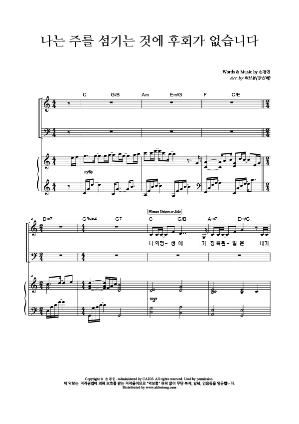 | 나는 주를 섬기는 것에 후회가 없습니다 | 성가 3부 + 피아노 반주 |