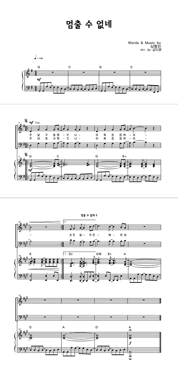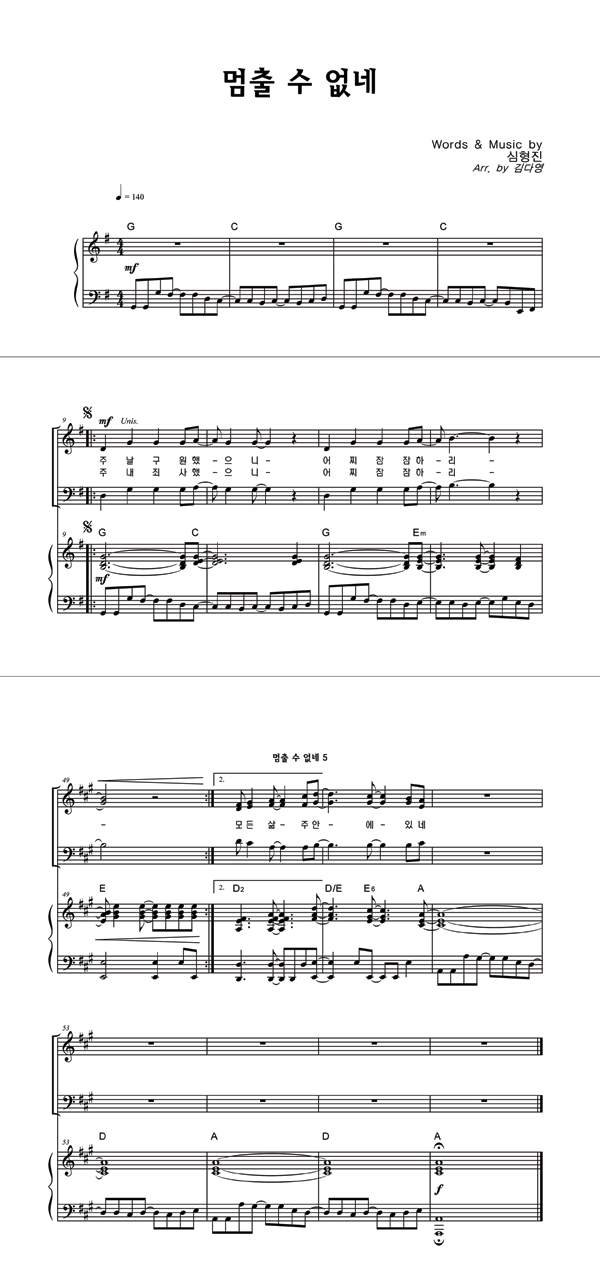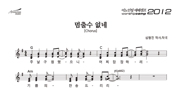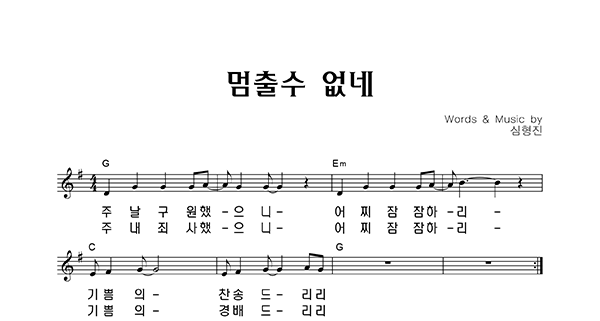 | 멈출 수 없네 | 성가 2부 + 피아노 반주 |