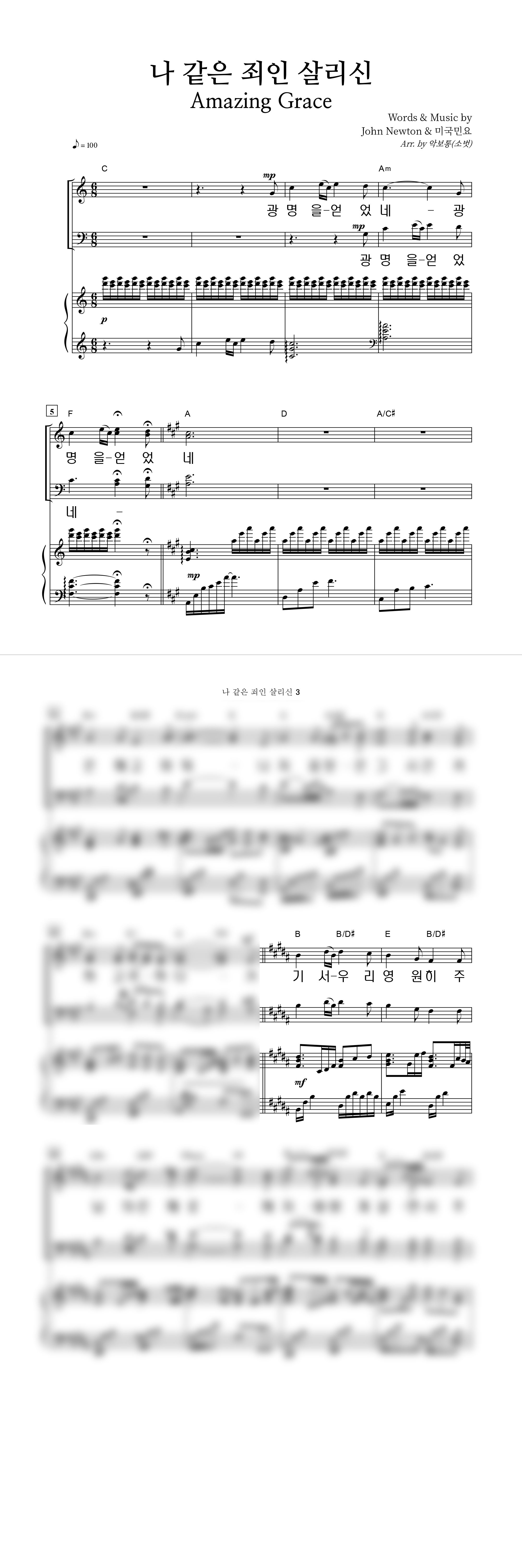| 나 같은 죄인 살리신 (찬송가 305장) | 성가 3부 + 피아노 반주 |