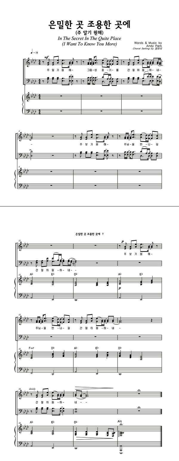 | 은밀한 곳 조용한 곳에 (주 알기 원해) | 성가 4부 + 피아노 반주 |