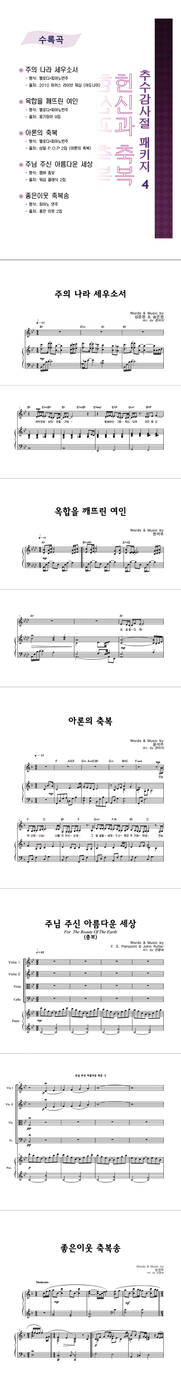 추수감사절 패키지 5곡 (주의 나라 세우소서, 옥합을 깨트린 여인, 아론의 축복, 주님 주신 아름다운 세상, 좋은 이웃 축복송) | 보컬+피아노반주 3단 | 여러 아티스트 | 여러 아티스트 |
